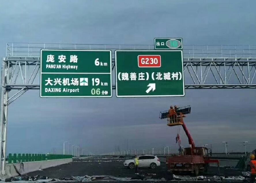 北京大興國際場外圍道路已重新規(guī)劃布局,相應(yīng)道路拖延延伸,路徑指引標志系統(tǒng)采用最先進的LED主動發(fā)光交通標志,標志實現(xiàn)時空同步,同一塊標志中既顯示到達大興機場距離,又讀取高德通行數(shù)據(jù),測算出平均車速,給出達到大興機場的時間,方便駕駛?cè)藛T有效規(guī)劃路徑、全天候視認標志版面,目前已全部完工、交付。