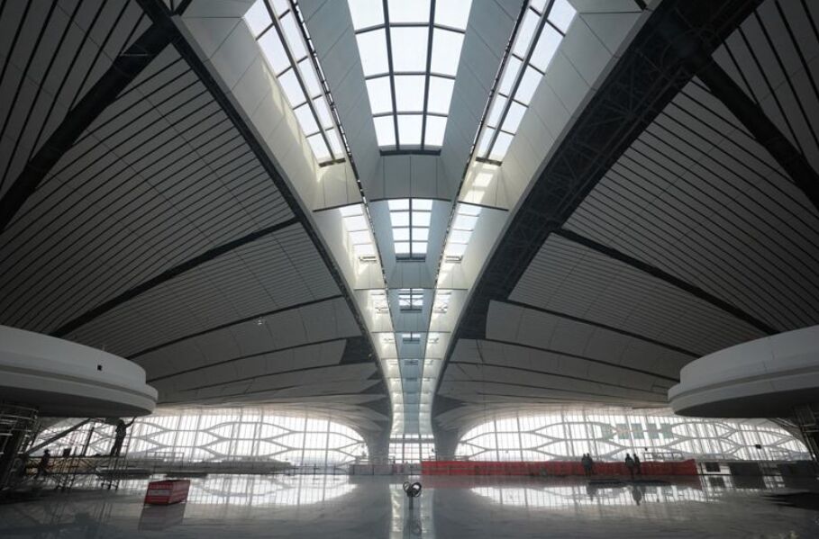 俯瞰北京大興國際機場,就像一只展翅欲飛的鳳凰,咖啡黃的外體,頭尾對稱,四翅展開,一副雄越宇宙的姿態(tài),主要主要由航站區(qū)、飛行區(qū)、綜合交通中心等部分組成。屋頂采用了鋼網(wǎng)架結(jié)構(gòu),由63450根桿件和12300個球節(jié)點拼裝而成,從空中看,形成了一個不規(guī)則的自由曲面空間。