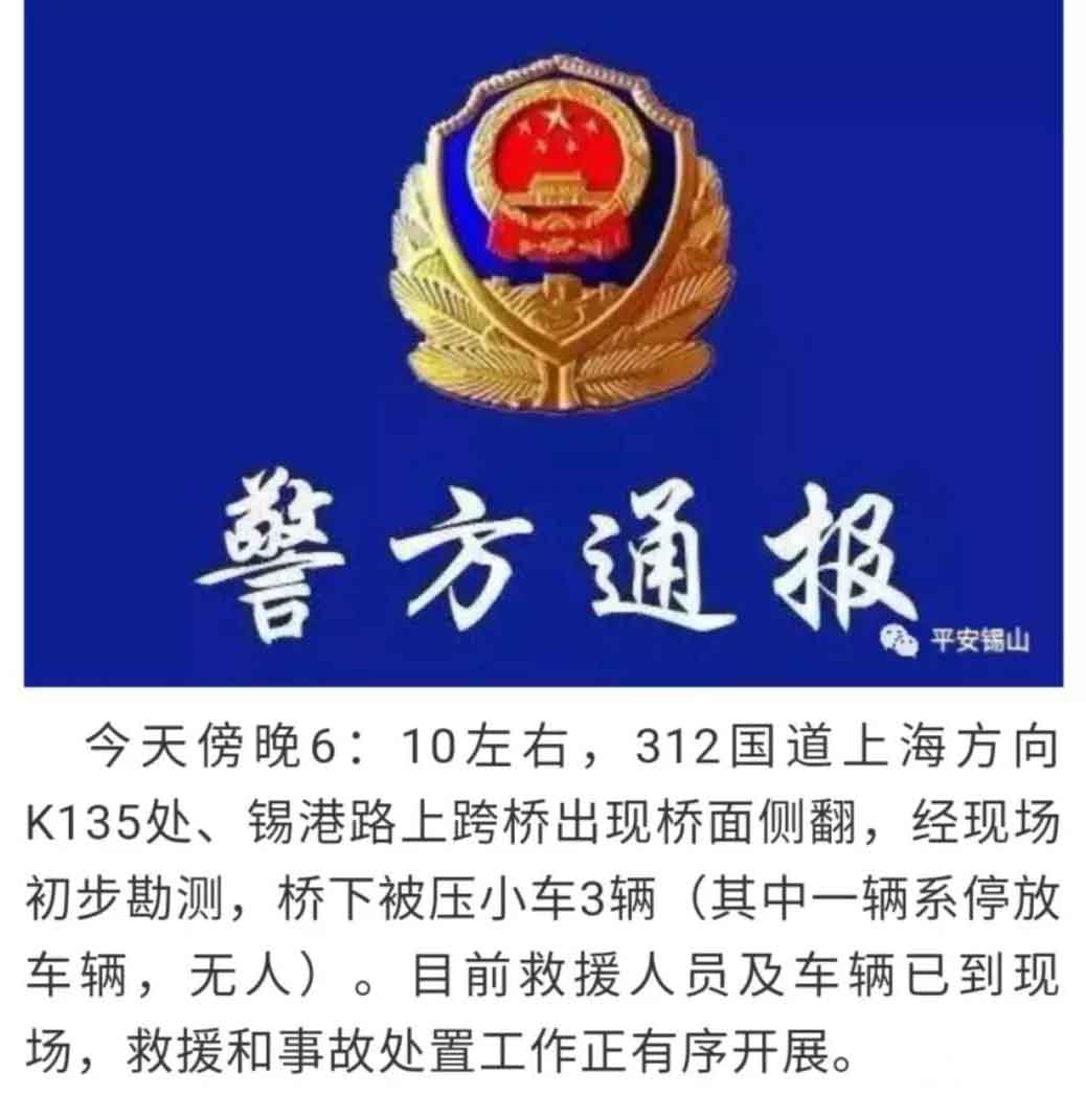 記者從無錫市錫山區(qū)警方獲悉,10月10日下午6:10左右,312國(guó)道上海方向K135處、錫港路上跨橋出現(xiàn)橋面?zhèn)确鹿剩?jīng)現(xiàn)場(chǎng)初步勘察,橋下被壓小車3輛(其中一輛系停放車輛,無人)。目前救援人員及車輛已到現(xiàn)場(chǎng),救援和事故處置工作正有序開展。
