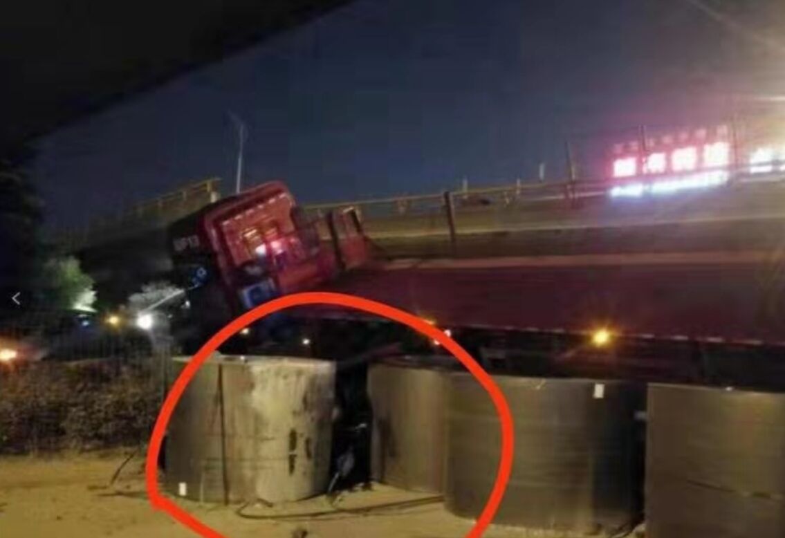 據(jù)了解,事故發(fā)生時(shí),通過的貨車嚴(yán)重超載,承載了6套熱軋卷板,每套重量約28535kg,算一算,貨品總重:28.535噸/卷*6卷=171.210噸。再加上貨車自重,整體重量約190噸。該貨車通行時(shí),行駛路徑為側(cè)邊行走,然后高架橋面?zhèn)确恕?/p>