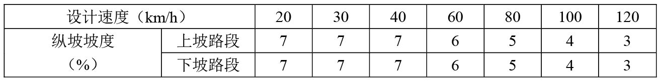 2、當(dāng)縱坡坡度值大于下表規(guī)定值時(shí),應(yīng)當(dāng)設(shè)置“上/下陡坡標(biāo)志”;當(dāng)縱坡坡度值小于下表規(guī)定值時(shí),對(duì)于經(jīng)常發(fā)生制動(dòng)失效事故的下坡路段,也可根據(jù)現(xiàn)場(chǎng)條件設(shè)置“下陡坡標(biāo)志”。