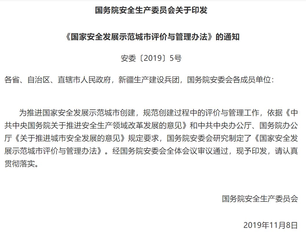 國務(wù)院安全生產(chǎn)委員會印發(fā)《國家安全發(fā)展示范城市評價與管理辦法》