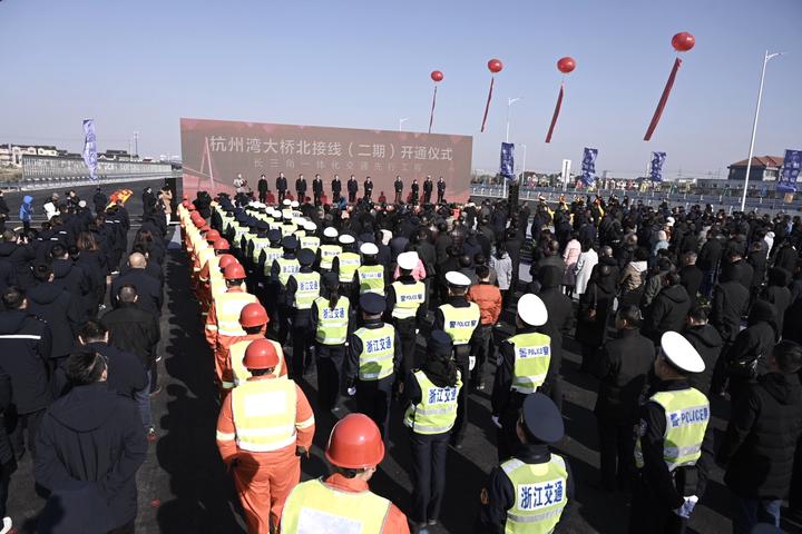 今天上午,灣北二期開通儀式在汾湖主線站區(qū)域舉行,長三角生態(tài)綠色一體化發(fā)展示范區(qū)執(zhí)委會、江蘇省交通運(yùn)輸廳、蘇州市人民政府、浙江省交通運(yùn)輸廳、浙江省高速交警總隊(duì)、上海市交通委綜合交通處等相關(guān)領(lǐng)導(dǎo),市委書記張兵,市委副書記、市長毛宏芳,市人大常委會主任劉冬生,市政協(xié)主席高玲慧等出席活動。張兵宣布杭州灣大橋北接線二期正式開通!