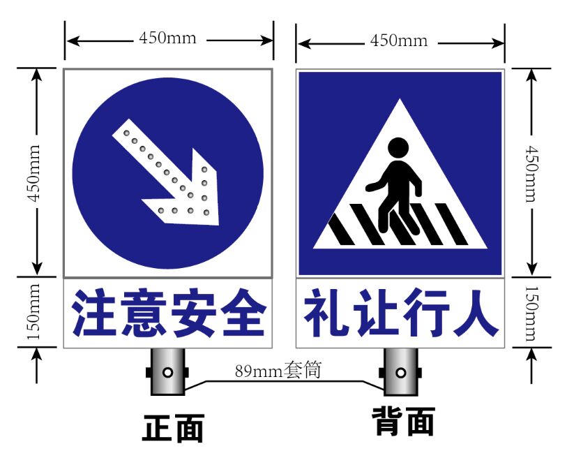 在交通安全工程中,為了讓某區(qū)域根據(jù)不同的車流方向設(shè)置不同的路權(quán),需要在入口顯眼處設(shè)定雙面標志牌,方便不同方向的車流觀察、確認,如中央隔離帶缺口處,設(shè)置雙面太陽能標志牌,一面為“允許掉頭”,另一面為“禁止掉頭”,用于區(qū)分來、去車輛的掉頭權(quán)利。當然,也存在這樣的雙面太陽能標志牌,正面為主標志信息版面,背面為“謹慎駕駛、注意安全”等交通安全宣傳標語。