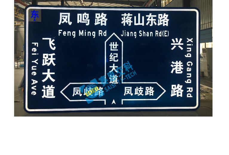 4、指路標(biāo)志 。在道路中,根據(jù)不同道路級(jí)別,設(shè)置于交叉口進(jìn)口方向,通常據(jù)進(jìn)口車(chē)道停止線80—120米范圍內(nèi)。