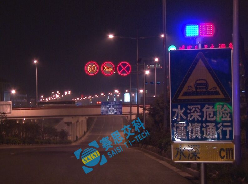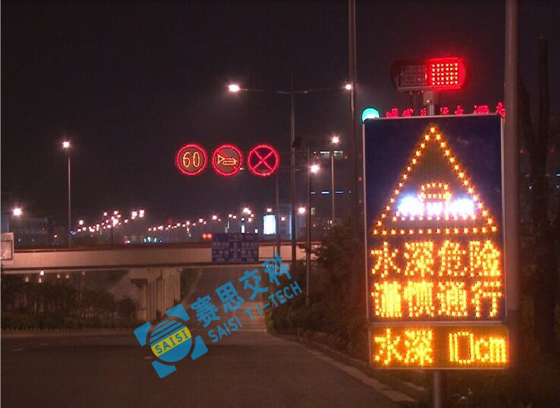 為避免以上情況發(fā)生,降低深積水對道路通行效率和駕駛安全的影響,賽康交安特開發(fā)本款專門針對積水路段、區(qū)域的積水自動感應預警標志系統(tǒng)。本預警標志采用太陽能供電系統(tǒng),通過在低水平區(qū)域預設智能水深檢測探頭對積水區(qū)進行自動檢測,并在積水區(qū)域前方預設的主動發(fā)光警示標志中動態(tài)顯示積水深度,來告知路段交通參與者前方水深信息,便于提前作出繞道行駛或可以通行的駕駛決策,以提高通行效率和駕駛安全。