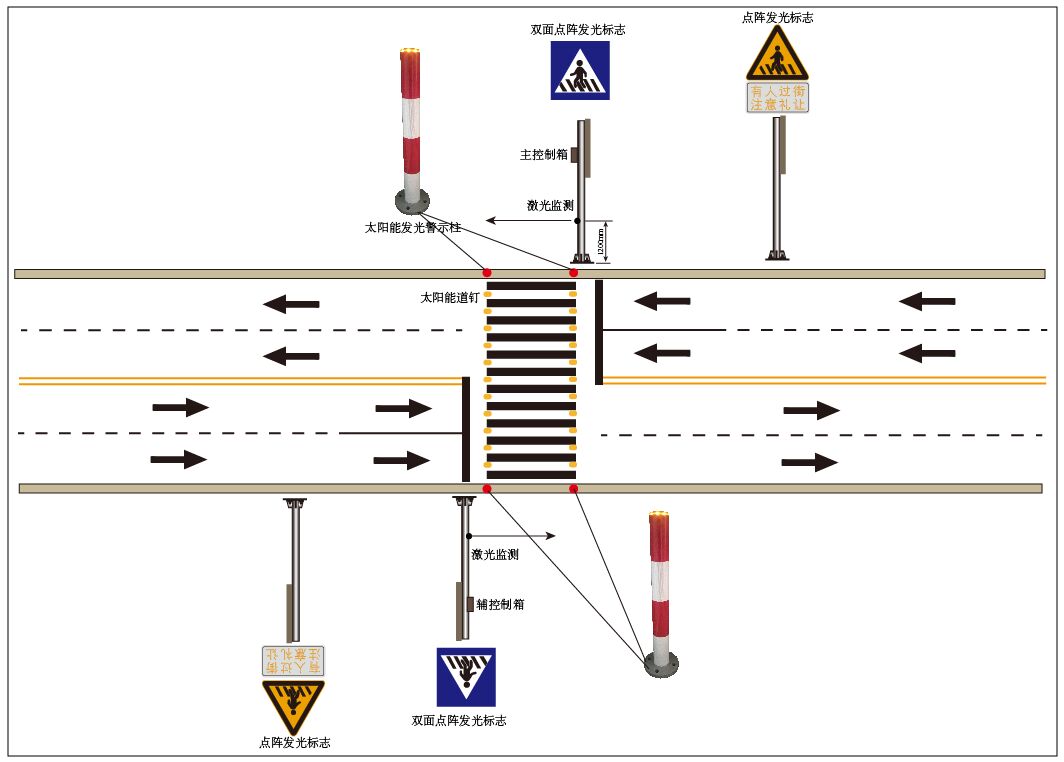 本智能行人過街預(yù)警系統(tǒng),主要包括:激光雷達監(jiān)測設(shè)備、人行橫道發(fā)光指示標志(雙面)、注意行人發(fā)光警告標志(輔標"有人過街、注意禮讓")、語音播報器、太陽能發(fā)光警示柱、太陽能發(fā)光道釘、無線數(shù)據(jù)傳輸模塊、總控制系統(tǒng)(含軟件)等。
