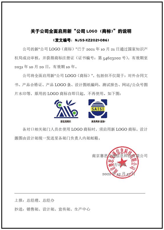 公司將全面啟用新“公司LOGO(商標)”,包括但不僅限于:對外合同文書、產(chǎn)品合格證、產(chǎn)品LOGO條、設計圖紙編碼、測試報告、網(wǎng)站/公眾號圖片水印等,原用的LOGO商標自即日起,不再使用。