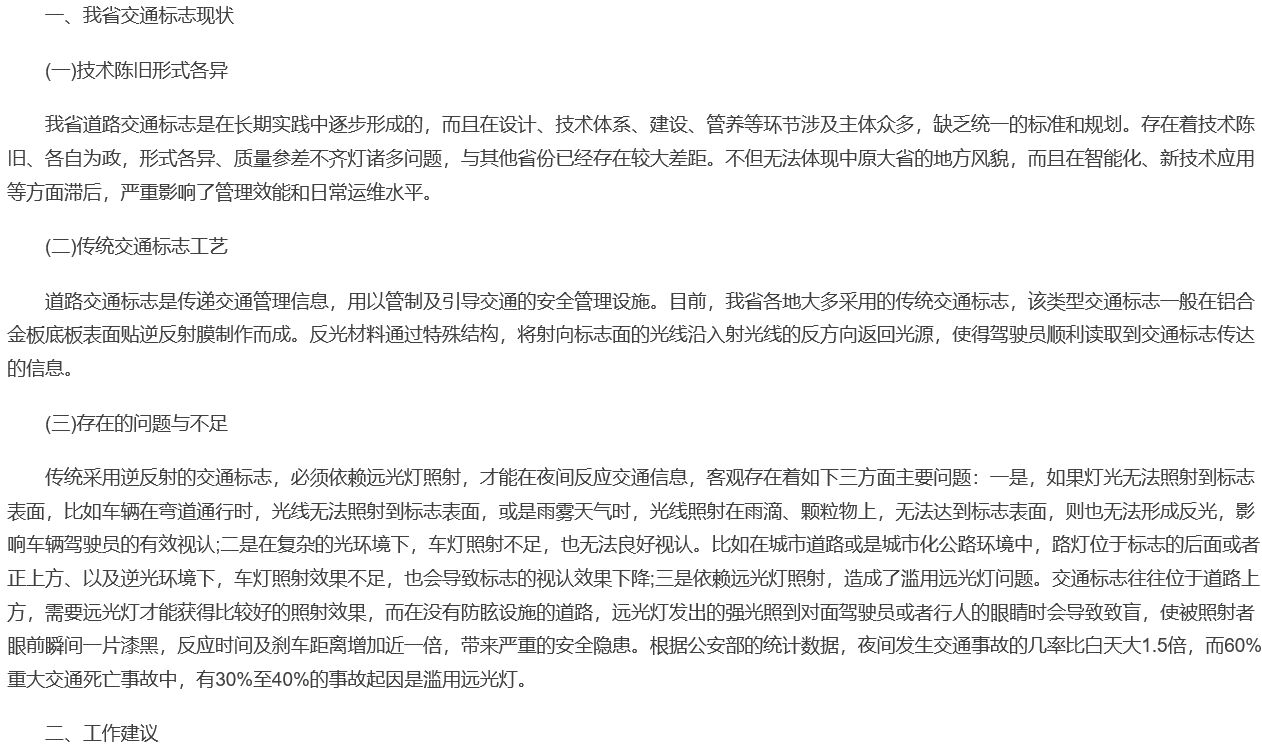 傳統(tǒng)的逆反射交通標志,在特殊的交通環(huán)境種,存在功能的局限性?!度嗣窠煌ňW(wǎng)》于2022年1月12日發(fā)文《關(guān)于編制統(tǒng)一的交通標志設置規(guī)范 推廣應用主動發(fā)光交通標志》中提到:“傳統(tǒng)采用逆反射的交通標志,必須依賴遠光燈照射,才能在夜間反應交通信息,客觀存在著如下三方面主要問題:一是,如果燈光無法照射到標志表面,比如車輛在彎道通行時,光線無法照射到標志表面,或是雨霧天氣時,光線照射在雨滴、顆粒物上,無法達到標志表面,則也無法形成反光,影響車輛駕駛員的有效視認;二是在復雜的光環(huán)境下,車燈照射不足,也無法良好視認。比如在城市道路或是城市化公路環(huán)境中,路燈位于標志的后面或者正上方、以及逆光環(huán)境下,車燈照射效果不足,也會導致標志的視認效果下降;三是依賴遠光燈照射,造成了濫用遠光燈問題。交通標志往往位于道路上方,需要遠光燈才能獲得比較好的照射效果,而在沒有防眩設施的道路,遠光燈發(fā)出的強光照到對面駕駛員或者行人的眼睛時會導致致盲,使被照射者眼前瞬間一片漆黑,反應時間及剎車距離增加近一倍,帶來嚴重的安全隱患。根據(jù)公安部的統(tǒng)計數(shù)據(jù),夜間發(fā)生交通事故的幾率比白天大1.5倍,而60%重大交通死亡事故中,有30%至40%的事故起因是濫用遠光燈?!?。