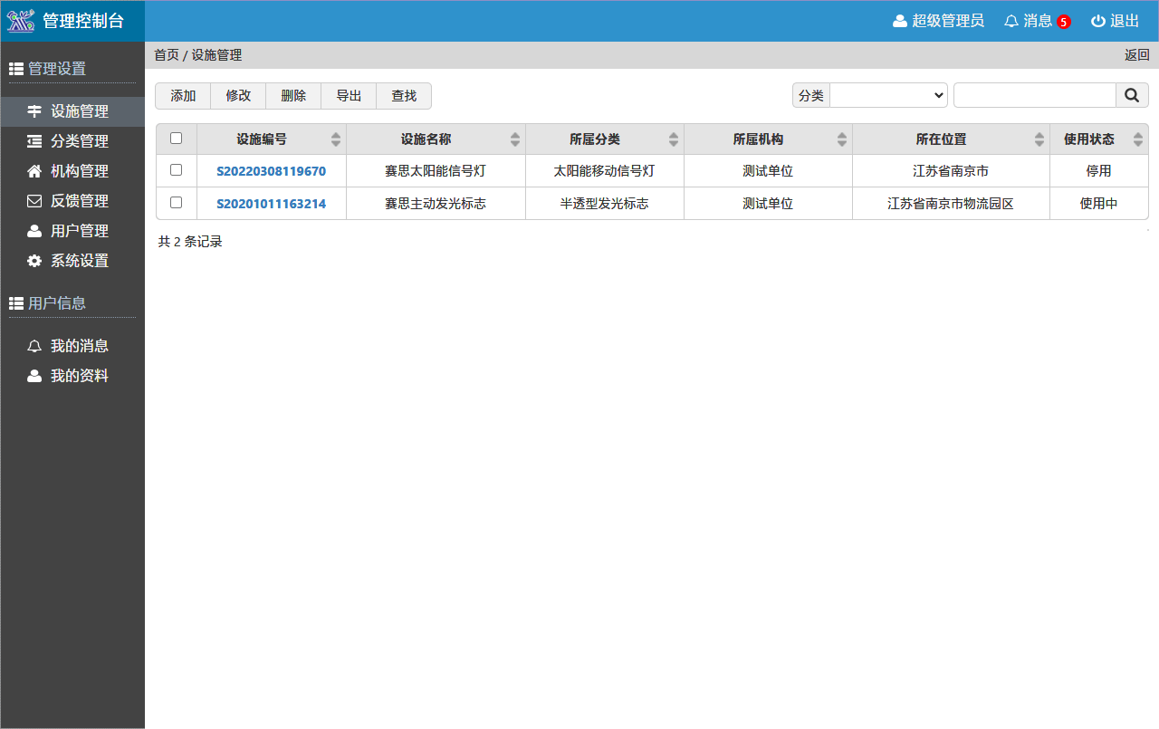 設(shè)施管理系統(tǒng)擁有完善的后臺管理功能,可按列表添加設(shè)施設(shè)備,可按層級添加分類、機構(gòu)。可以添加多個管理用戶,并設(shè)置不同管理權(quán)限。當(dāng)收到反饋信息后,能及時顯示新消息數(shù)量。在反饋管理模塊中,可查看當(dāng)前反饋的信息列表,及時處理對應(yīng)問題。