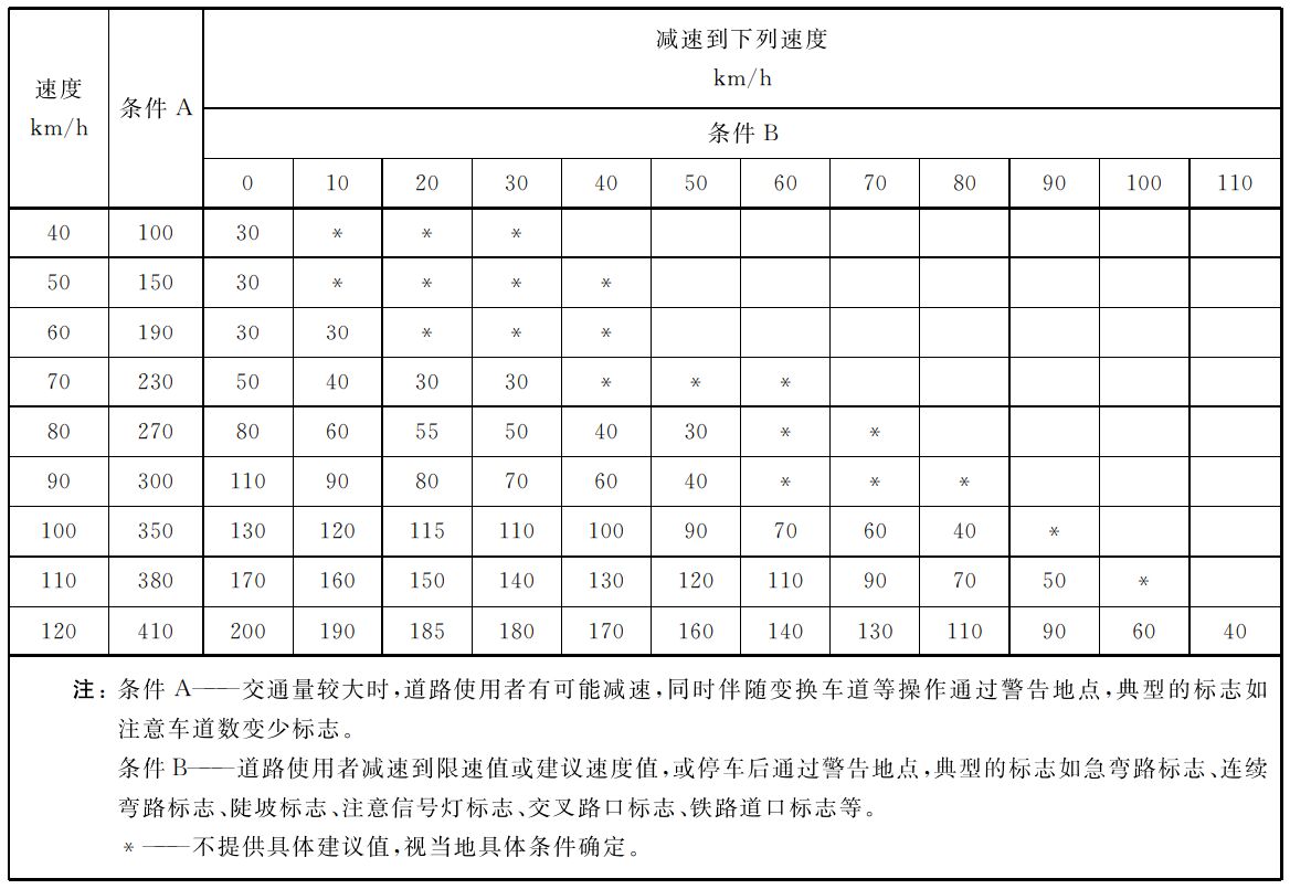 交通事故管理區(qū)標志采用專用的熒光粉紅色為底板,區(qū)別于常見的藍、黃、綠色為底色,讓標志從視覺上更具沖擊力,司機在很遠處看到粉紅色標志,也許字樣還未看清,但已明白前方區(qū)域肯定與事故管控有關。本標志用于警告前方路段正在進行道路交通事故管理,車輛駕駛員應減速慢行、停車等候或繞道行駛,應根據道路限速情況,設置于事故發(fā)生區(qū)域前方的適當位置,前置距離一般值,參考如下列表。