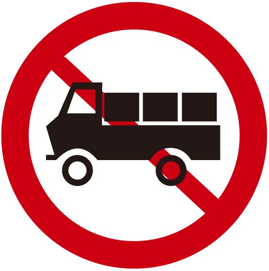 司機小柳每次幫我們送貨,都會問是不是禁區(qū),他說:“新到一個地方,我們哪里熟悉路況!常常導航顯示出口下來不遠,就到了,可快臨近時,信號燈桿上卻掛著“禁貨標志”,明明地方比較偏,卻是限貨;或者目的地不限貨,而我們卻不知道在一群限貨路段,如何繞到那里!“只知道哪里不能走!卻不知道哪里能走!”所以,大概率只能掉頭,找個偏的地方,等到夜里11點后再送過去!”我告訴他,以前只有“禁止貨車”禁令標志,沒有就能走!基本就是“排除法”,現(xiàn)在,國標《道路交通標志和標線》(GB5768.2~2022版)中,已明確給出了“貨車通行”指示標志圖案(下圖右),看見這個標志,就是專門讓你們行走的路段,逐漸地,各個地區(qū)都會規(guī)劃出“物流線”,并設(shè)置這款標志,這樣就更清晰了。