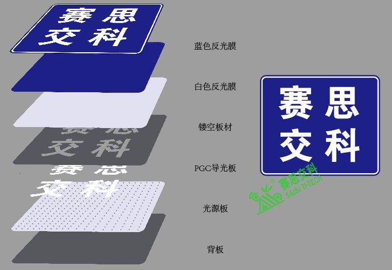 背透式主動發(fā)光標(biāo)志,以藍(lán)白配色的指路標(biāo)志為例,如果從正面一刀切開,我們會依次看到:藍(lán)色反光膜、白色反光膜、鏤空雕刻的鋁板(鏤空位置填充的PGC透光板)、高亮混光型光源板(含內(nèi)部支撐結(jié)果)、電路元器件、標(biāo)志背板、滑槽。而所有的這些,都要集中布設(shè)在厚度僅為4cm左右的框體結(jié)構(gòu)內(nèi),所以,對整體結(jié)構(gòu)的穩(wěn)定性、布設(shè)的合理化、用材搭配的精細(xì)化,都要求非常高。
