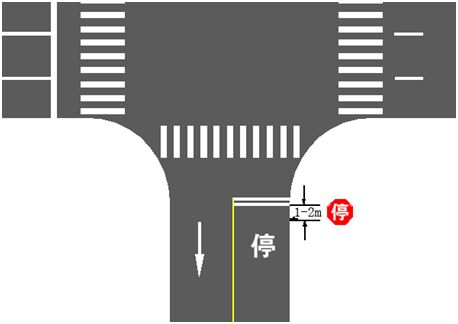 5、停車讓行標志一般設(shè)置在交叉口需要車輛停車的停止線前1~2m處,并不妨礙交叉口通視三角區(qū)視距。