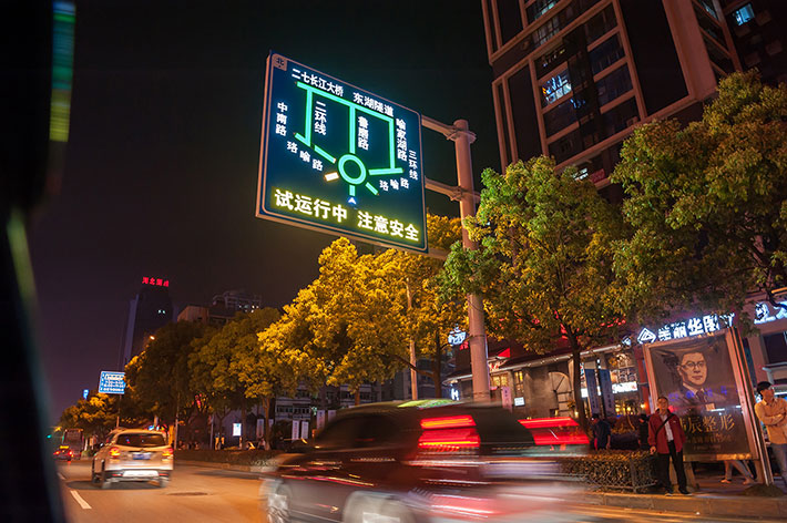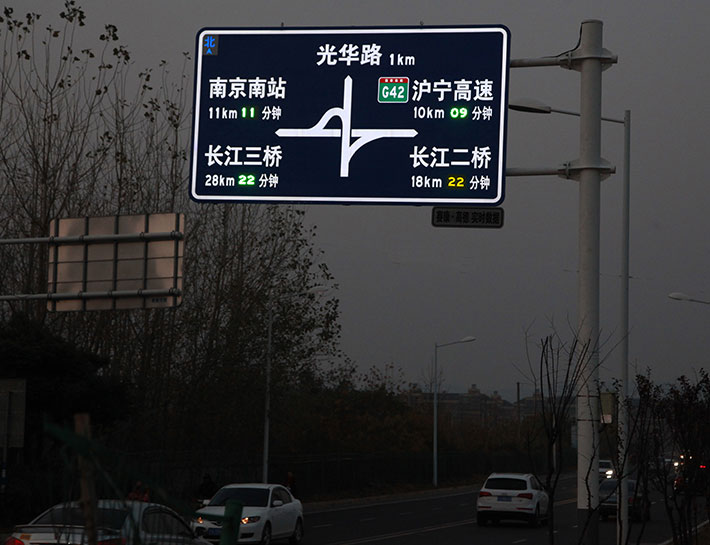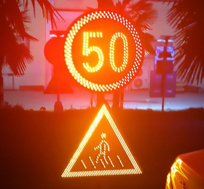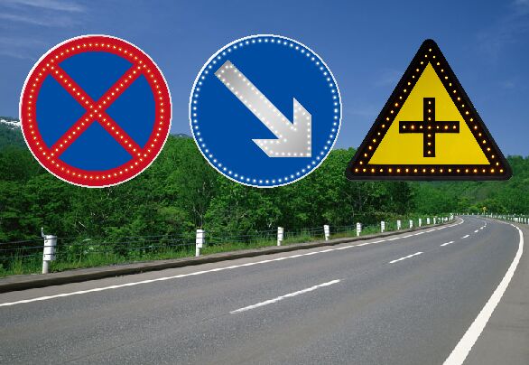 “外置LED點(diǎn)陣”工藝,所應(yīng)用的LED發(fā)光管具備極強(qiáng)的光穿透性,特別是在陰雨、霧霾等道路能見度低的交通場景中,其優(yōu)點(diǎn)在于表現(xiàn)關(guān)鍵圖案的警示效果,再應(yīng)用頻閃的發(fā)光模式,根據(jù)遠(yuǎn)距離警示效果,尤其適用于提示道路危險(xiǎn)源的警示標(biāo)志,和傳達(dá)管理指令的禁令標(biāo)志等。但其不足之處在于:顯示文字、字符、小圖案等沒有“內(nèi)置LED投射”工藝那么飽滿、平整。所以,為追求最佳視覺效果,通常會(huì)根據(jù)同一塊版面中的不同內(nèi)容,選擇最佳的工藝表現(xiàn)方式,如:可變車道標(biāo)志潮汐車道標(biāo)志,我們會(huì)采用這樣的工藝方式處理,邊緣線采用的半投射工藝,箭頭采用“外置LED點(diǎn)陣”工藝。如:帶有輔標(biāo)的禁令標(biāo)志,禁令圖標(biāo)部分采用“外置LED點(diǎn)陣”工藝,輔標(biāo)部分采用“內(nèi)置LED投射”的全投射工藝。