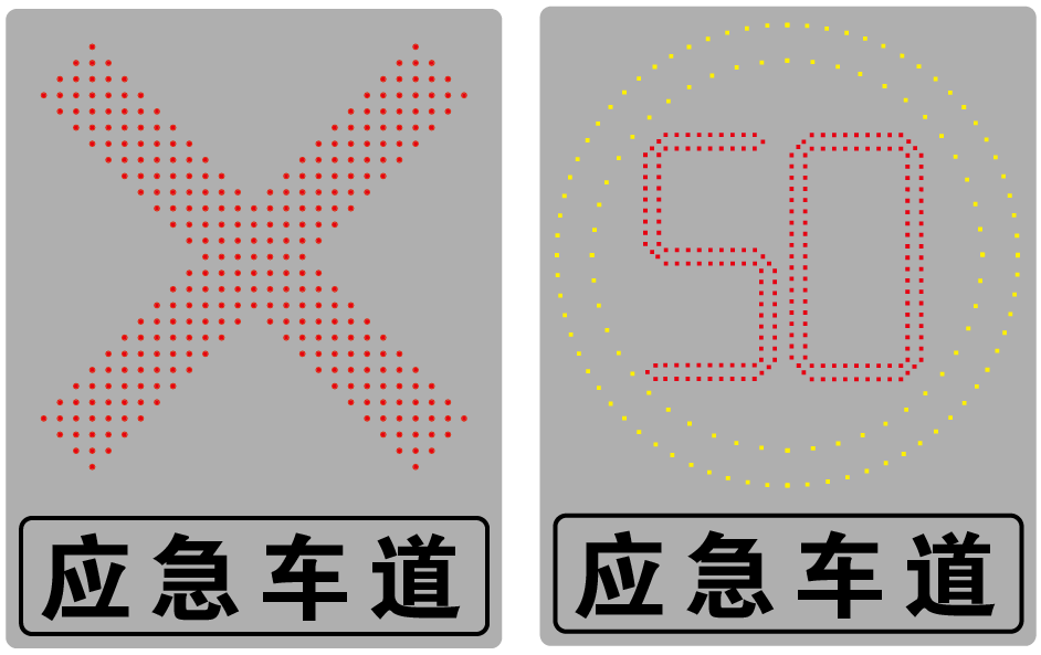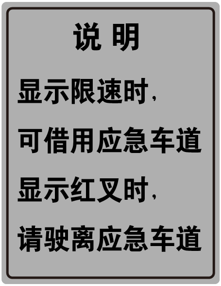 5、標(biāo)志版面:“應(yīng)急車道”為共用版面,另圖案“紅叉”與“限速禁令”版面二合一。