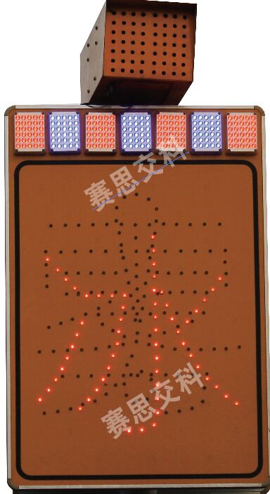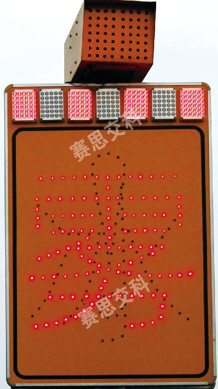 3、標(biāo)志版面:標(biāo)志整體為IV類黃色底模,不貼字膜,通過LED線型點(diǎn)陣勾勒出險情圖案或文字,標(biāo)志上部設(shè)置各四只紅藍(lán)交替簡易型爆閃燈。